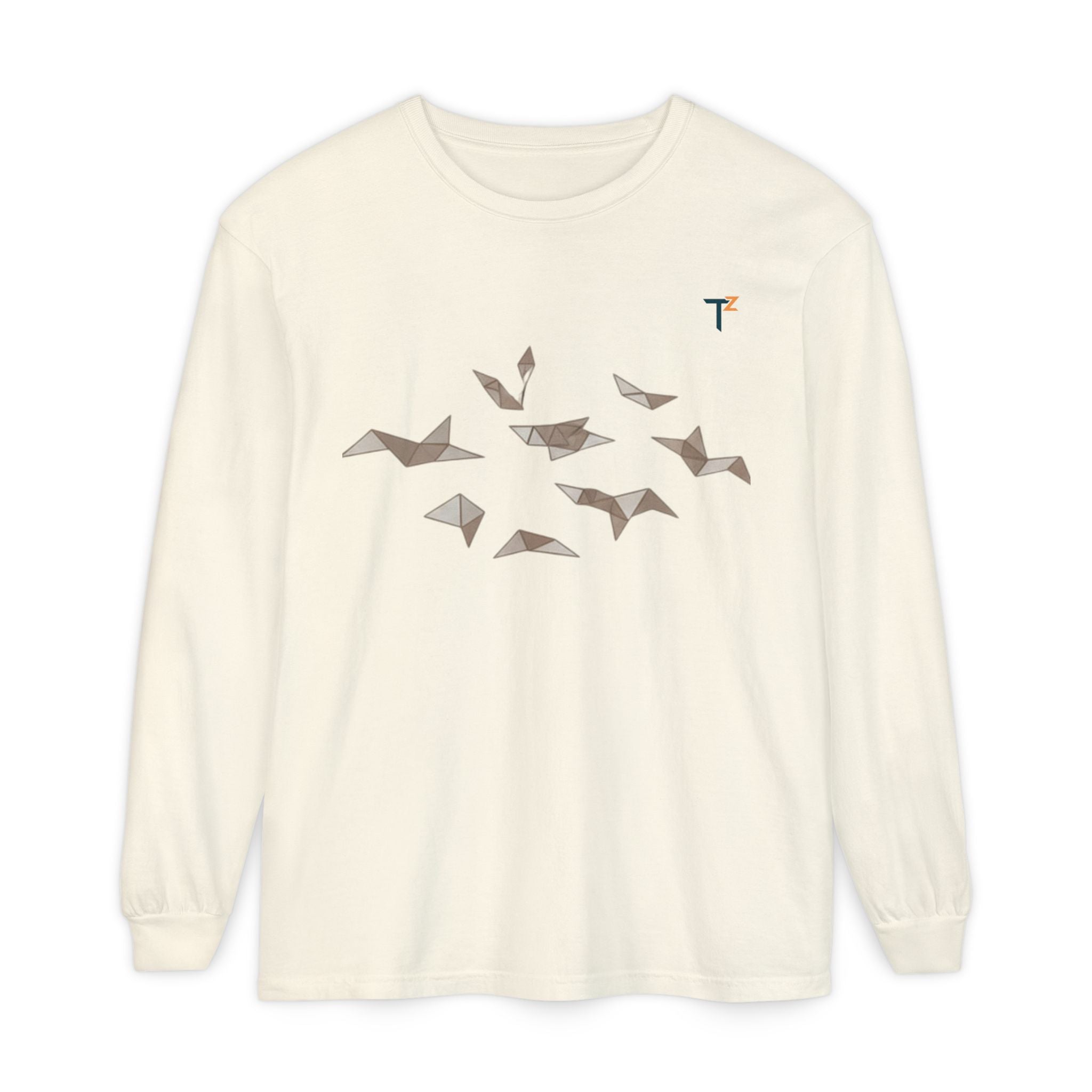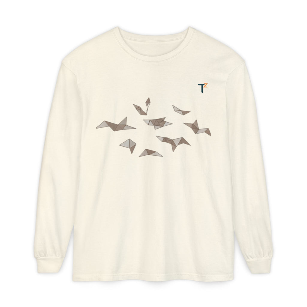Whimsical Bird Origami Long Sleeve Tee, Casual, Unisex, Nature Lover Gift, Eco-friendly Fashion, Spring Style, Everyday Wear